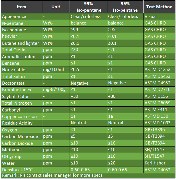 产品用途:异戊烷主要用于聚乙烯生产用冷凝剂,在冰箱、冰柜等行业代替氟利昂作制冷剂、箱体发泡剂、配制催化剂等。